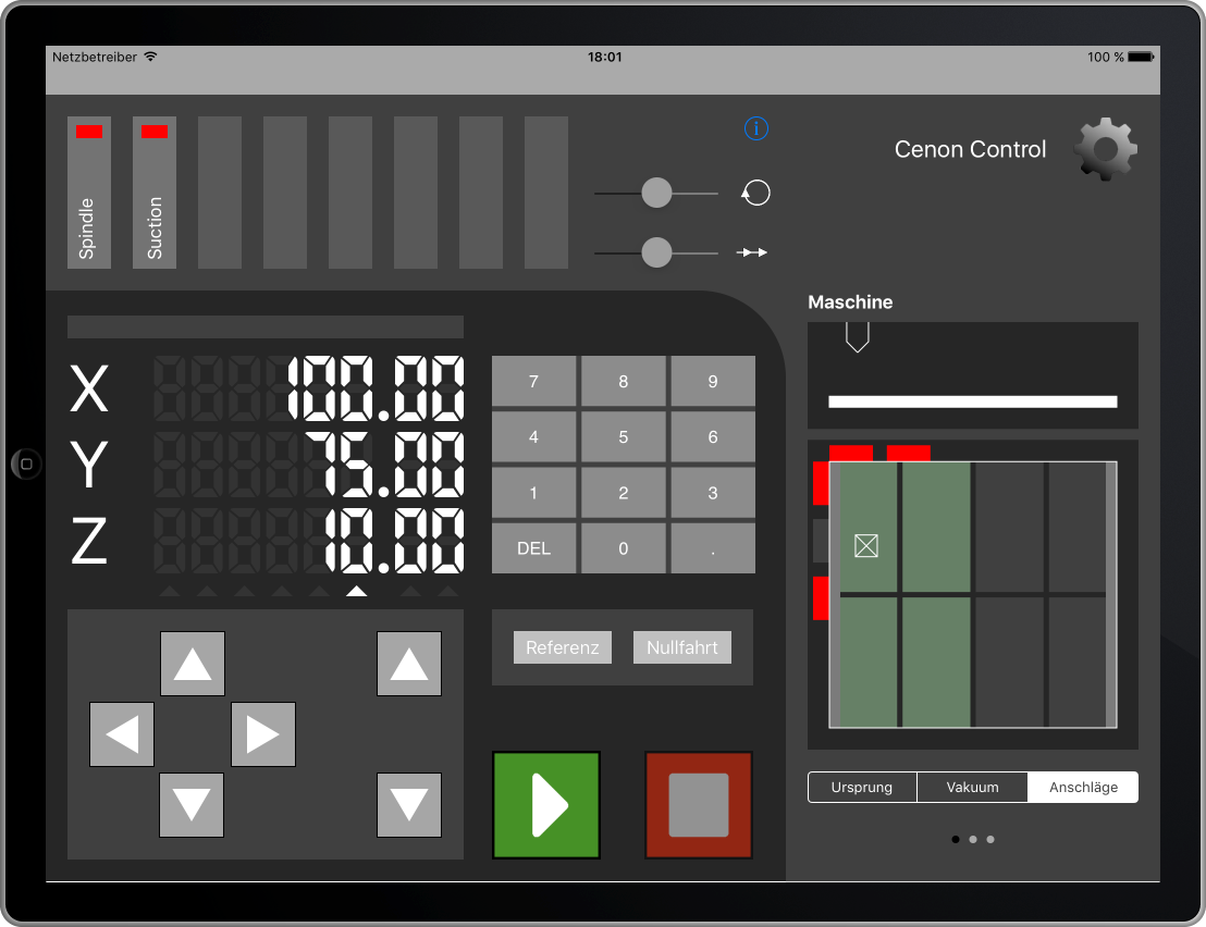 Die Cenon Control App ist ein Panel zur Maschinen-Steuerung für die Fertigungs-Software Cenon CAM (auf Mac). Cenon Control verbindet sich über das lokale WiFi Netzwerk mit Cenon. Sobald verbunden, kann Cenon Control die Maschine und die Ausgabe vom iPad aus steuern, also immer von der optimalen Position an der Maschine, mit dem perfekten Blick auf das Werkstück.