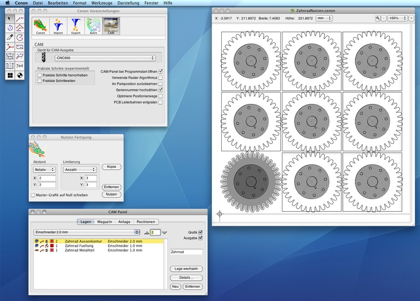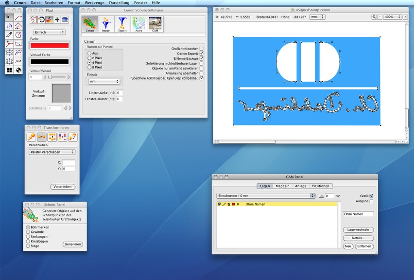 Cenon ist eine ausgereifte Lösung für die Fertigung. Sie können mit Hilfe von Cenon alle Arbeitsabläufe, wie beispielsweise Schneiden, Gravieren, Fräsen, Bohren, Plotten, Falzen, etc., mit einem einzigen Programm realisieren. Darüberhinaus bietet Cenon Leistungsfunktionen für spezielle Anforderungen unterschiedener Fertigungsbereiche.