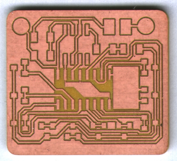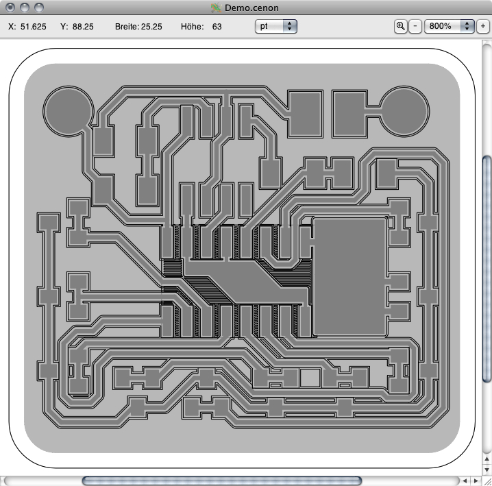 | | Isolationsgravur mit Entgraten Layout-Daten können im Gerber-Format oder PostScipt importiert werden. Cenon unterstützt das extended Gerber-Format, so dass Sie sich nicht mit Aperture-Tabellen herumschlagen müssen. An schmalen Stellen der Isolationsgravur bilden sich gerne ungewünschte Grate. Diese werden durch die Entgratungs-Funktion von Cenon entfernt. |
