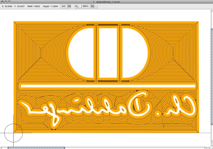 | | Voransicht der Ausgabepfade. Das Resultate des Ausspitzens und Ausräumens kann vor der Ausgabe am Bildschirm betrachtet werden. Auf diese Weise kann die Richtigkeit kontrolliert werden und eventuelle Korrekturen an Werkzeug-Durchmessern etc. vorgenommen werden. |